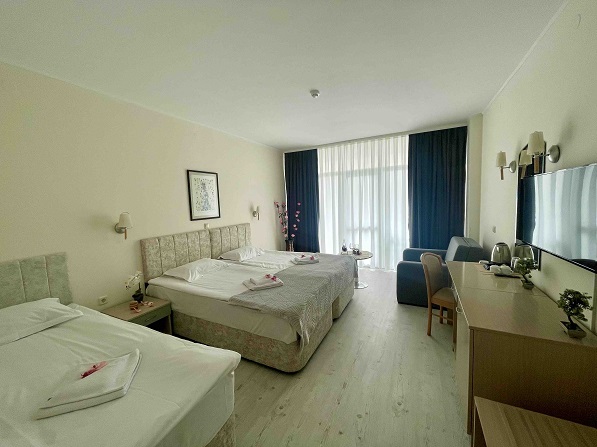 Dotari camere duble: paturi twin, 1 pat extensibil, aer conditionat individual, tv satelit, telefon, minibar, balcon mobilat, gresie in camera, baie cu dus sau cada, uscator de par.