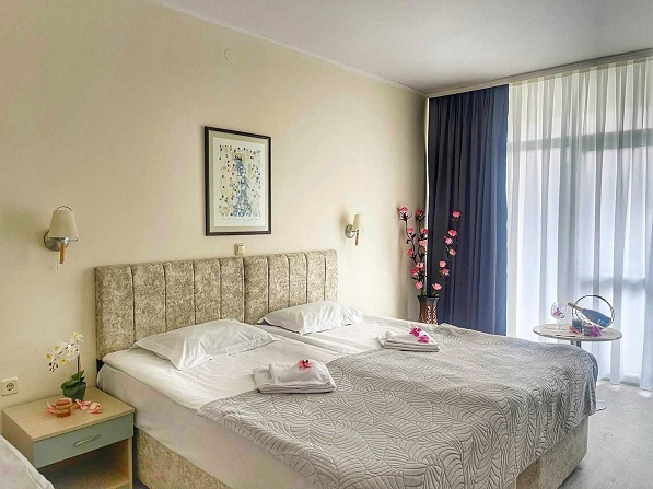 Dotari apartamente cu 1 dormitor: living cu canapea extensibila (2 pers.), dormitor cu paturi twin, aer conditionat individual, tv satelit, telefon, frigider, minibar, internet, balcon mobilat, gresie in camera, baie cu dus sau cada, uscator de par.